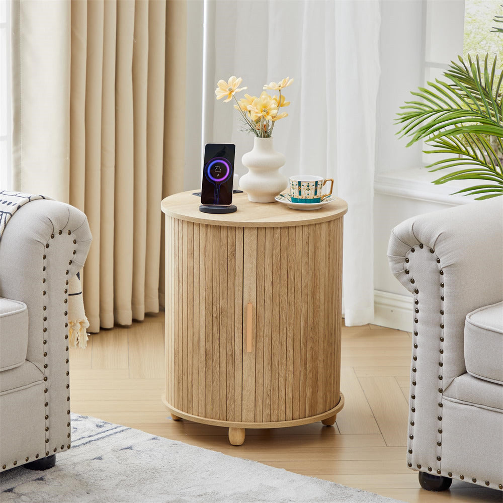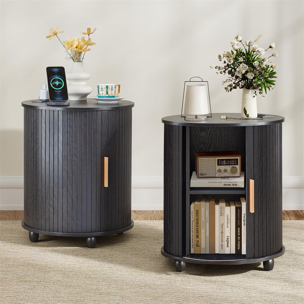 Mid-Century Round Nightstand: Meet the perfect blend of form and function—our round fluted nightstand is designed for urban apartments, cozy bedrooms, and chic living rooms. With its unique circular silhouette, elegant fluted sliding door, and sleek metal knob, this piece serves as both a practical side table and a statement decor item. Whether placed next to your bed as a convenient bedside table or alongside your sofa as a versatile end table, it delivers timeless modern appeal.