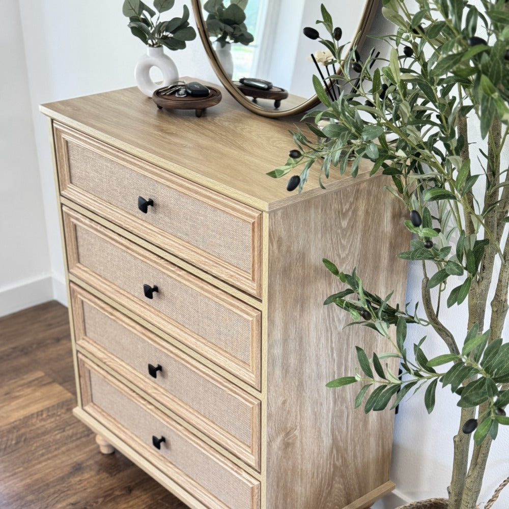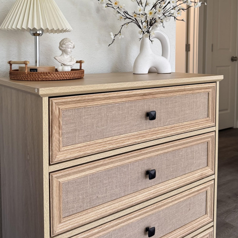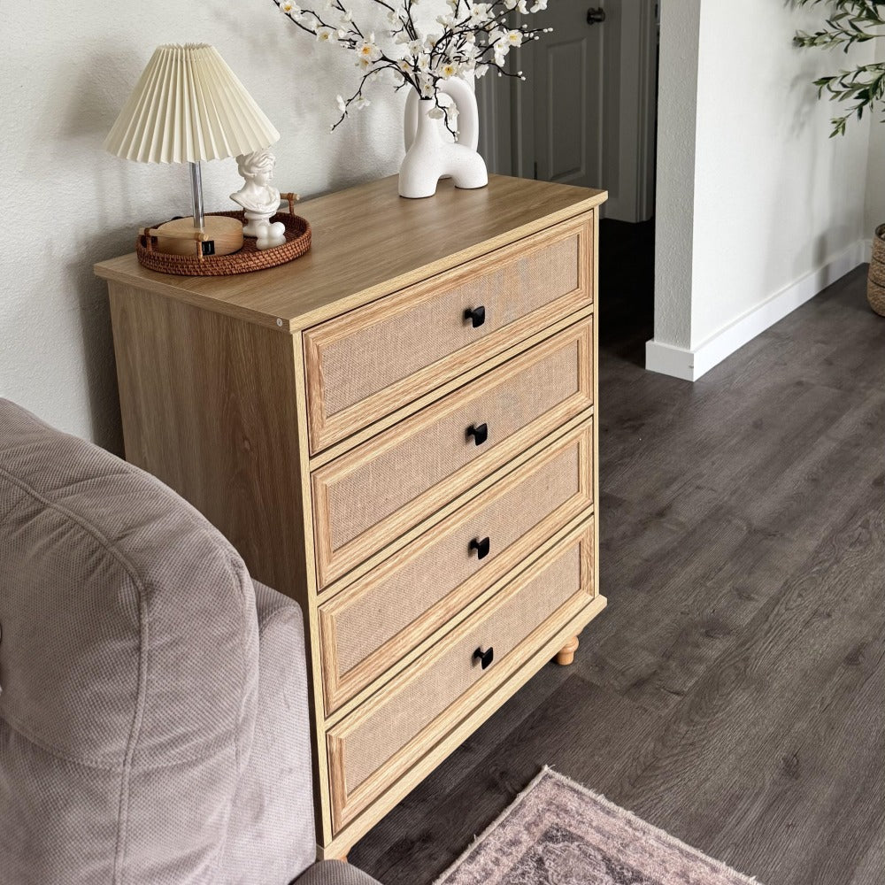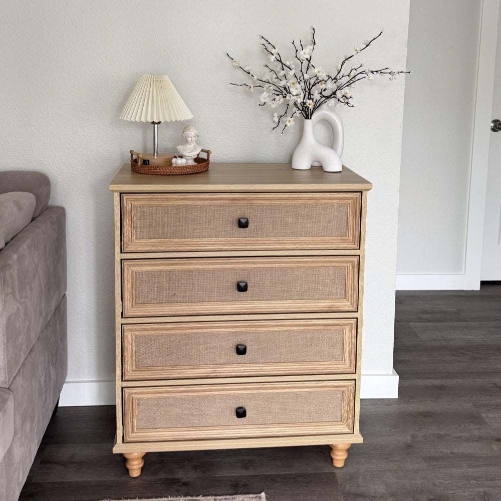 Mid-Century Modern 4 Drawer Dresser with Burlap Rattan Drawers
