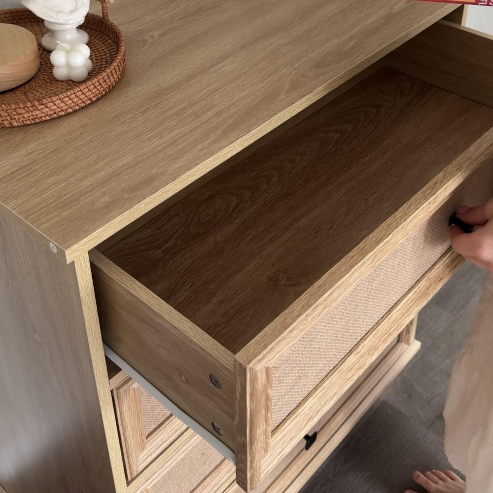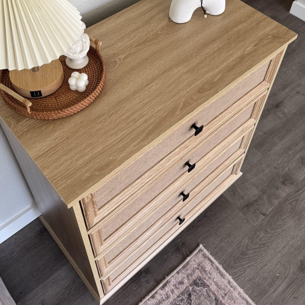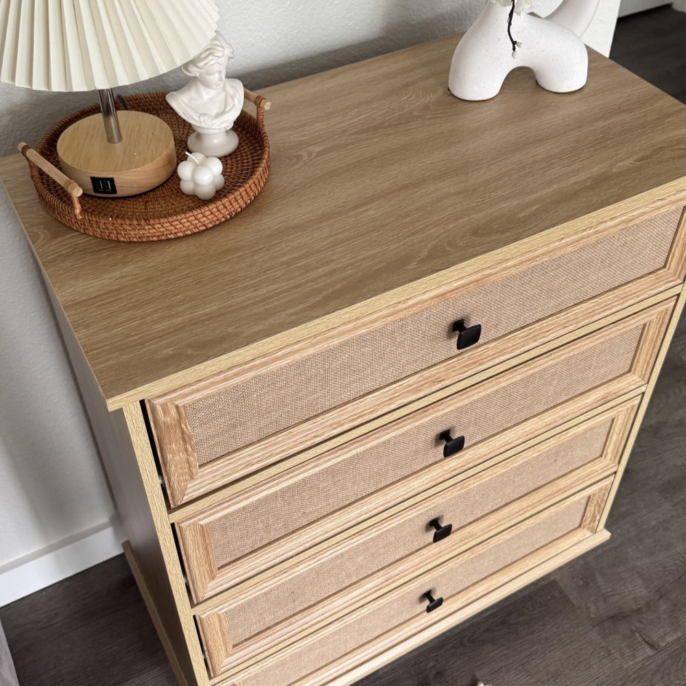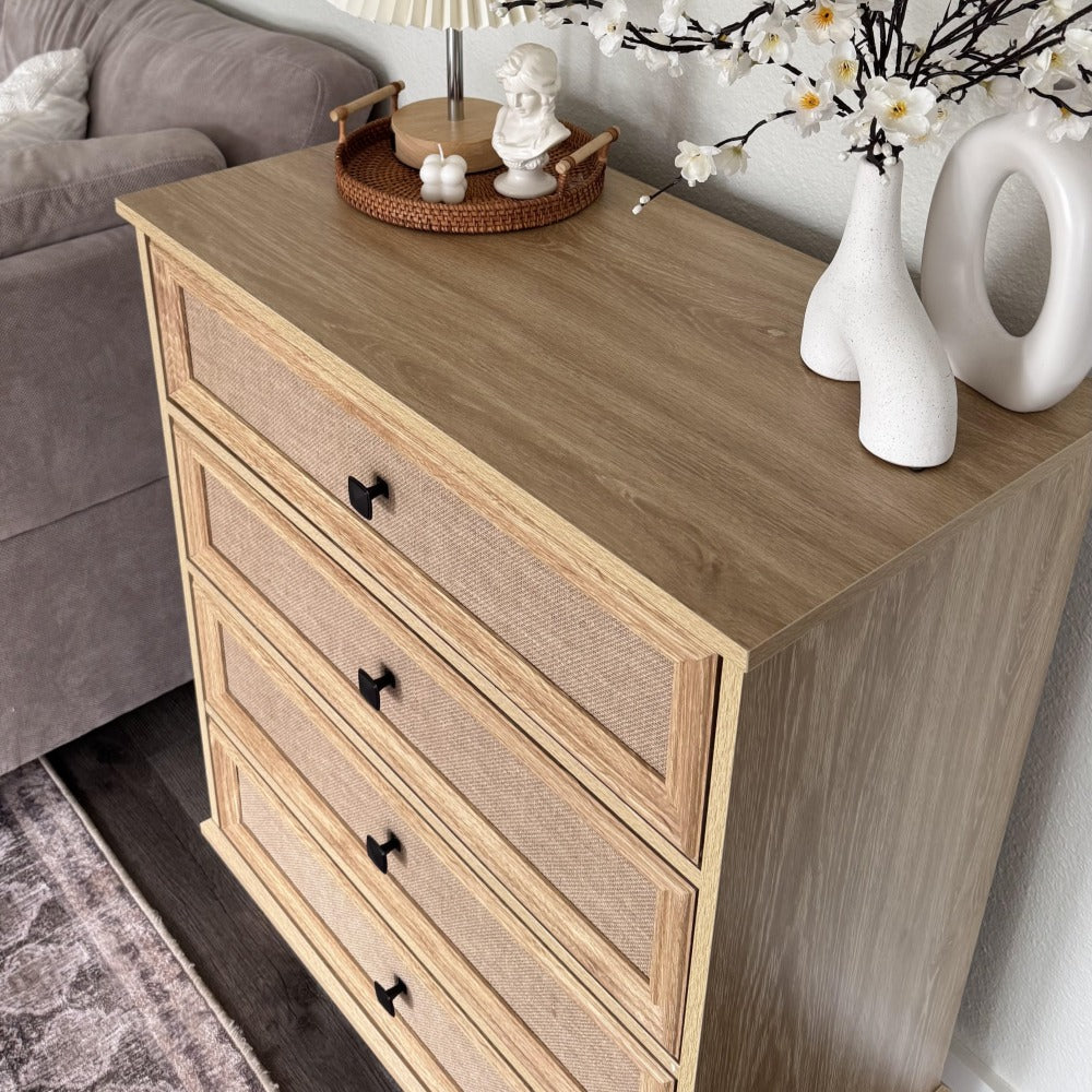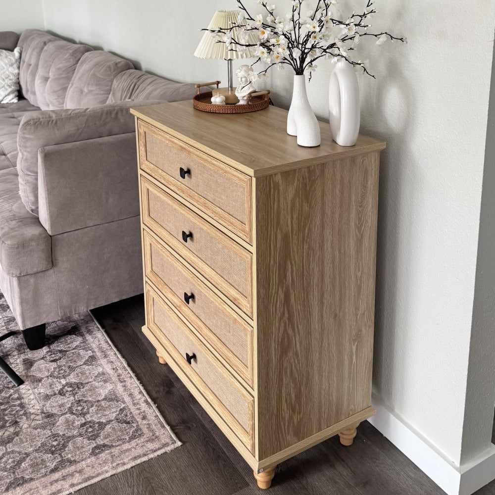 Mid-Century Modern 4 Drawer Dresser with Burlap Rattan Drawers