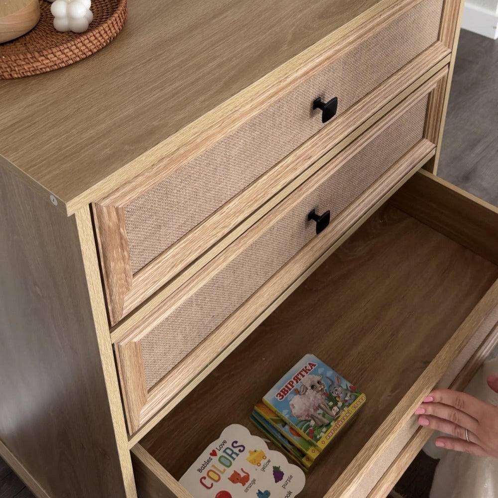 Bring timeless style to your space with this mid-century modern dresser, featuring burlap rattan-textured drawers, conical wood legs, and a natural wood-tone finish. The elegant design adds warmth and character, perfect for bedrooms, living rooms, or nurseries.