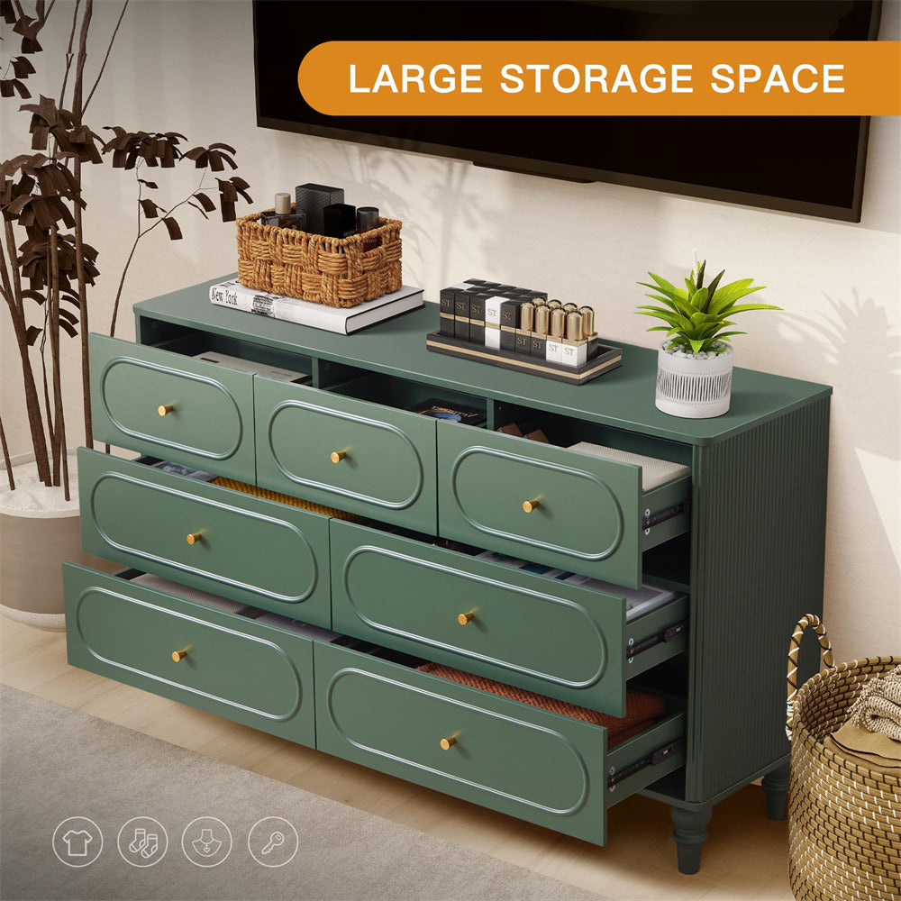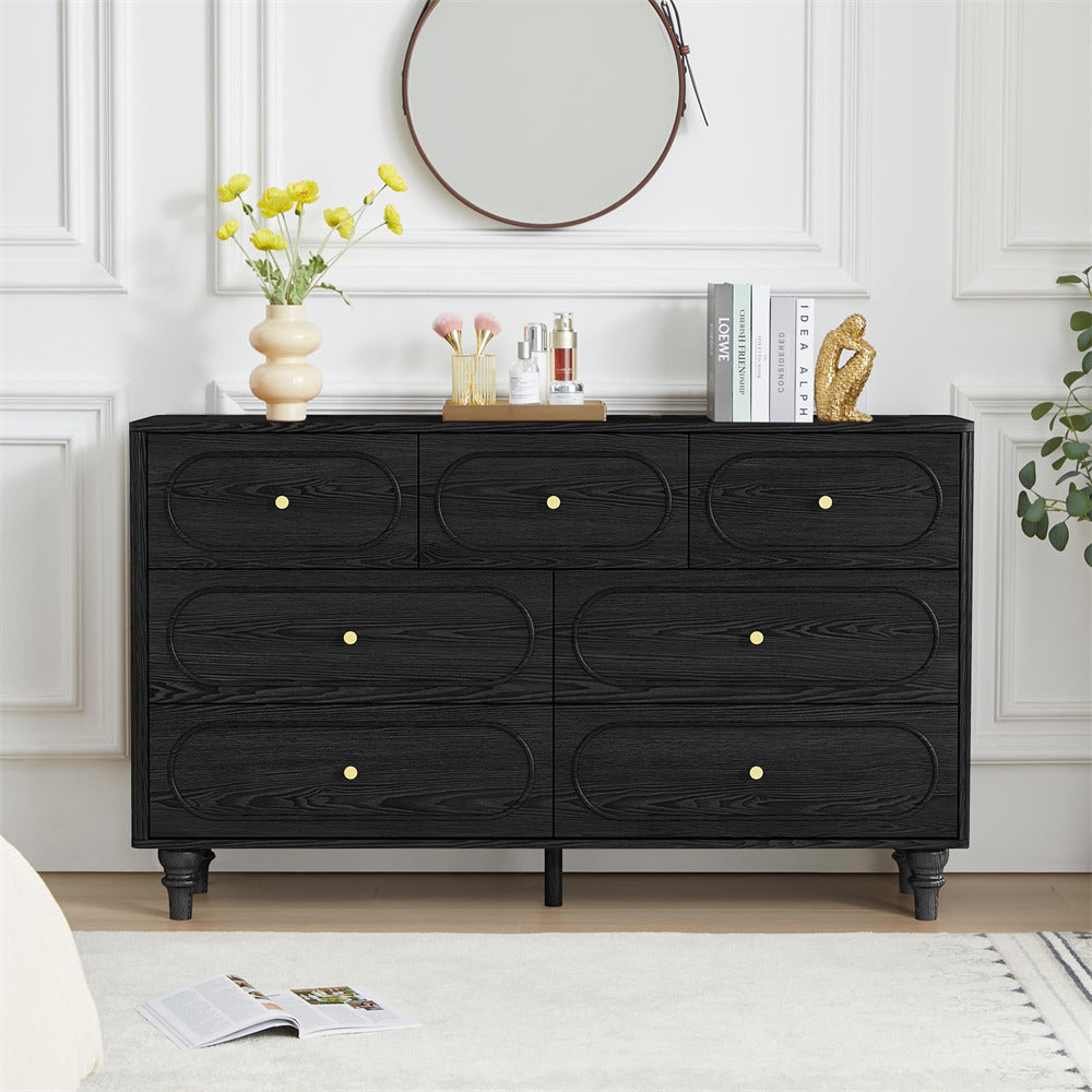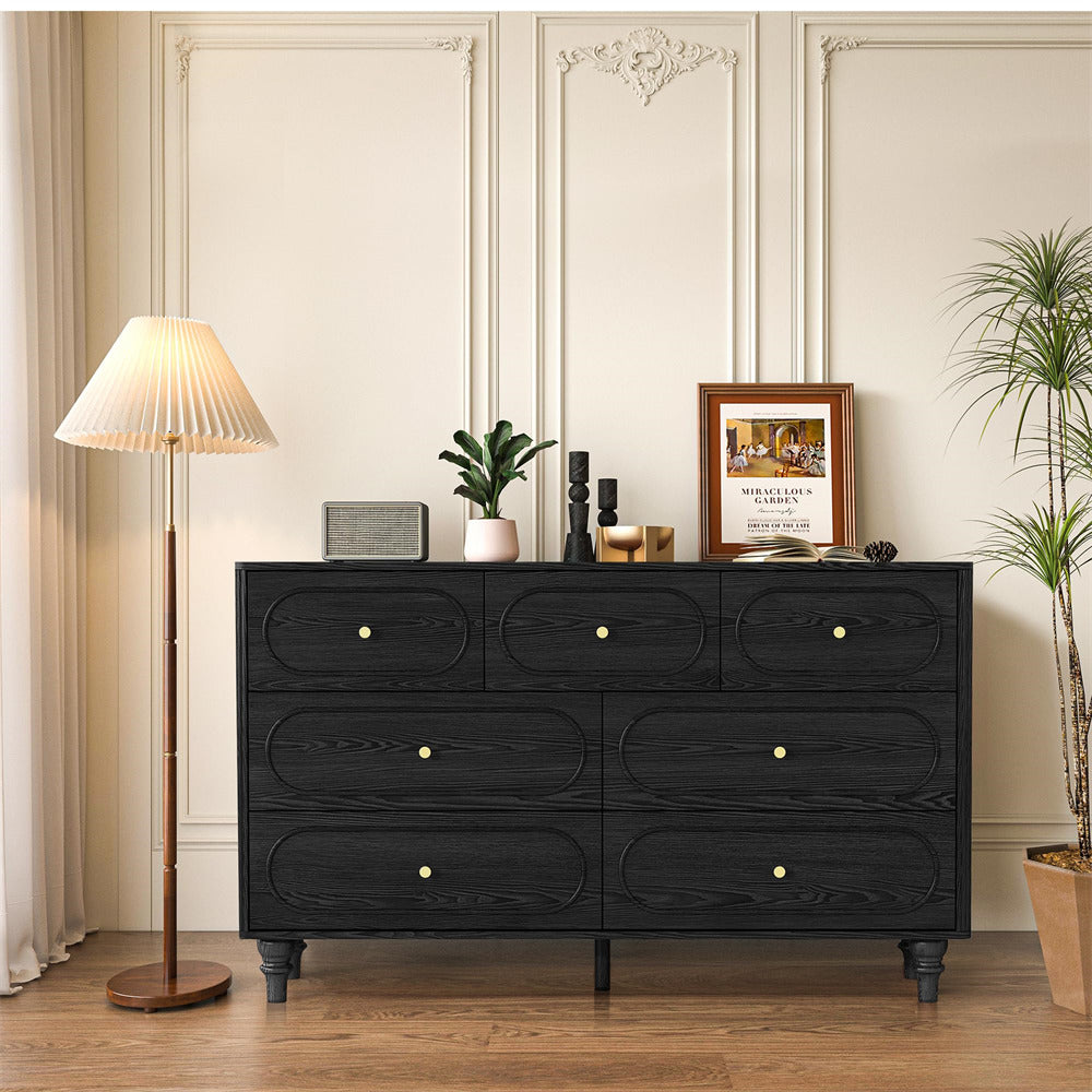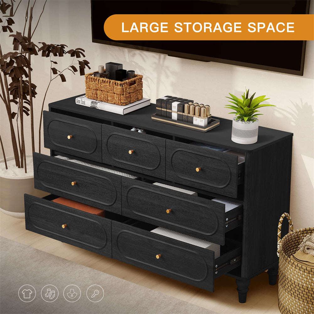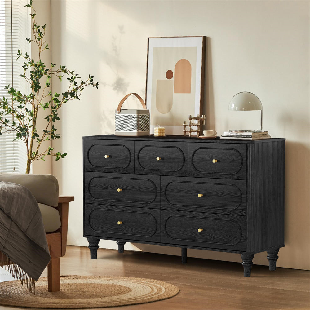 Mid Century Modern Style: Immerse yourself in the allure of our 7 drawer dresser, featuring a oval overall design and captivating fluted wave on the sides. Unlike traditional drawer dressers, our cabinet legs boast a conical shape, while the surface color beautifully replicates the natural wood tone. Experience a modern and unique aesthetic that effortlessly elevates the entire ambiance of your space.