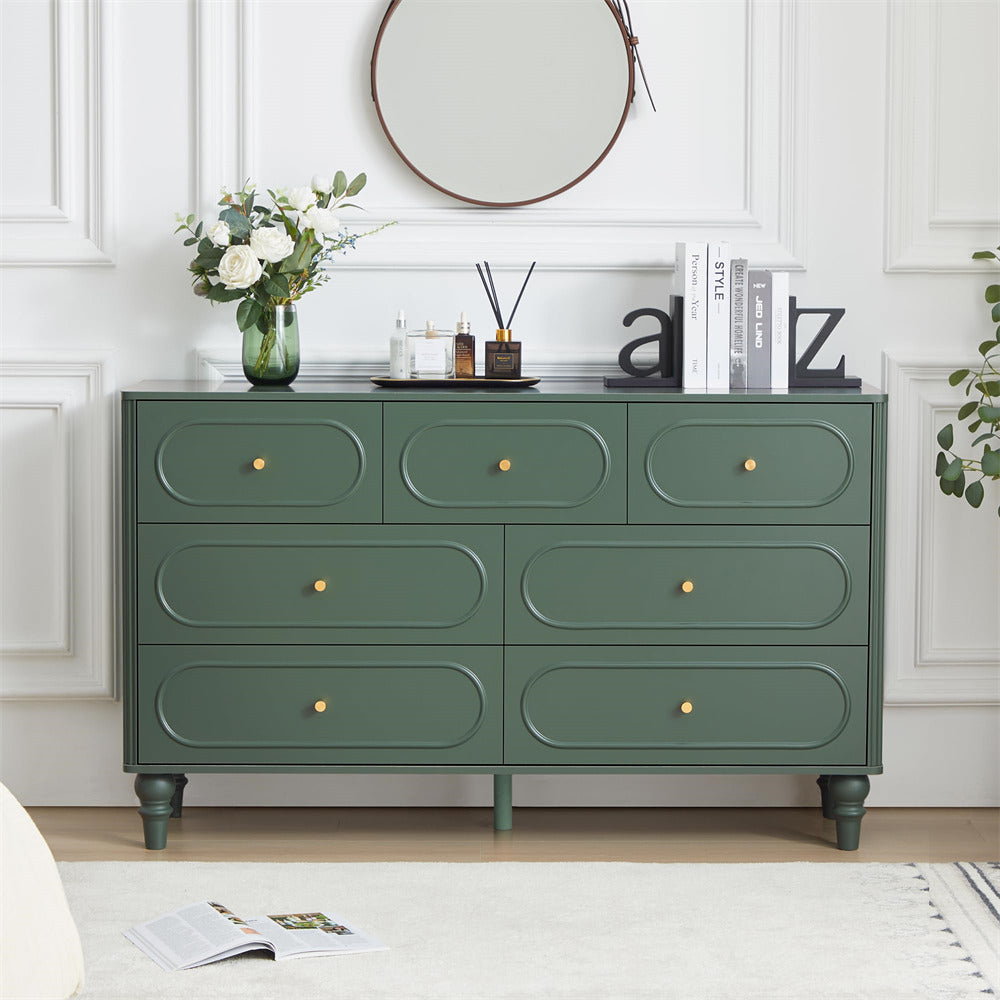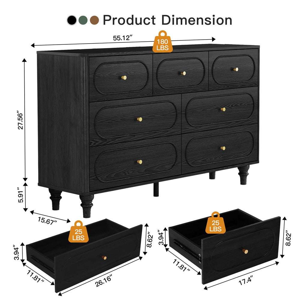 Suitable for Various Scenarios: Available in walnut, black, and green, our seven-drawer dressing table is a versatile addition to any room. Whether you need a stylish end table for your sofa, a functional large bedside table, or a storage solution for your baby's room, this dresser fits the bill. Choose the perfect color and purpose, and witness how it becomes a practical and beautiful decoration in your home.