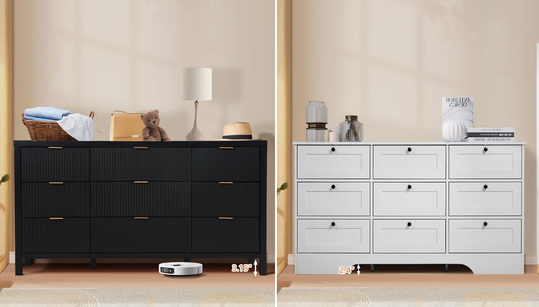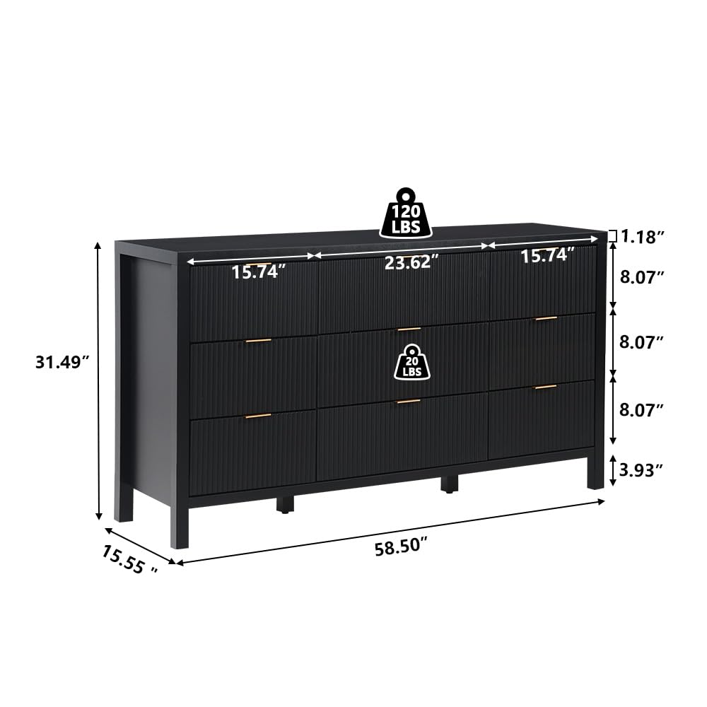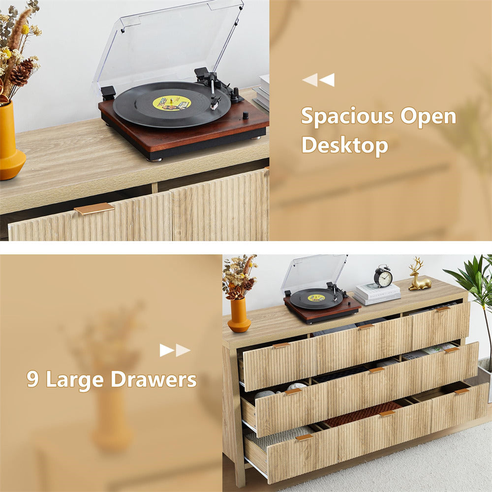 Large Storage Space: The wood dresser has 9 large drawers, which provide ample space for your daily storage. Large storage space design, it can accommodate toys, daily necessities, magazines, and so on. And an open platform on top of the table, you can put vases, photo albums, water cups and other decorations on it, and store other personal items in the drawer for easy storage next time. This drawer dresser is a perfect storage solution for various occasions, such as bedroom, nursery room.