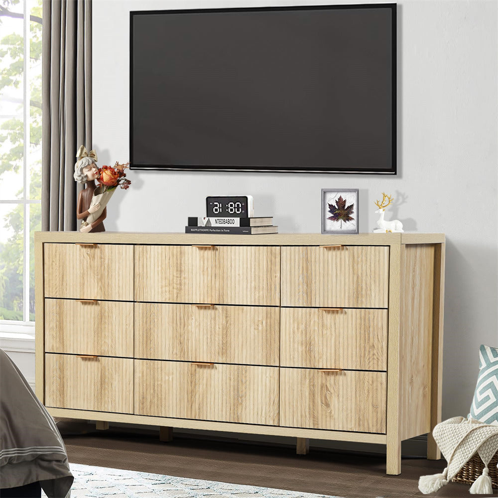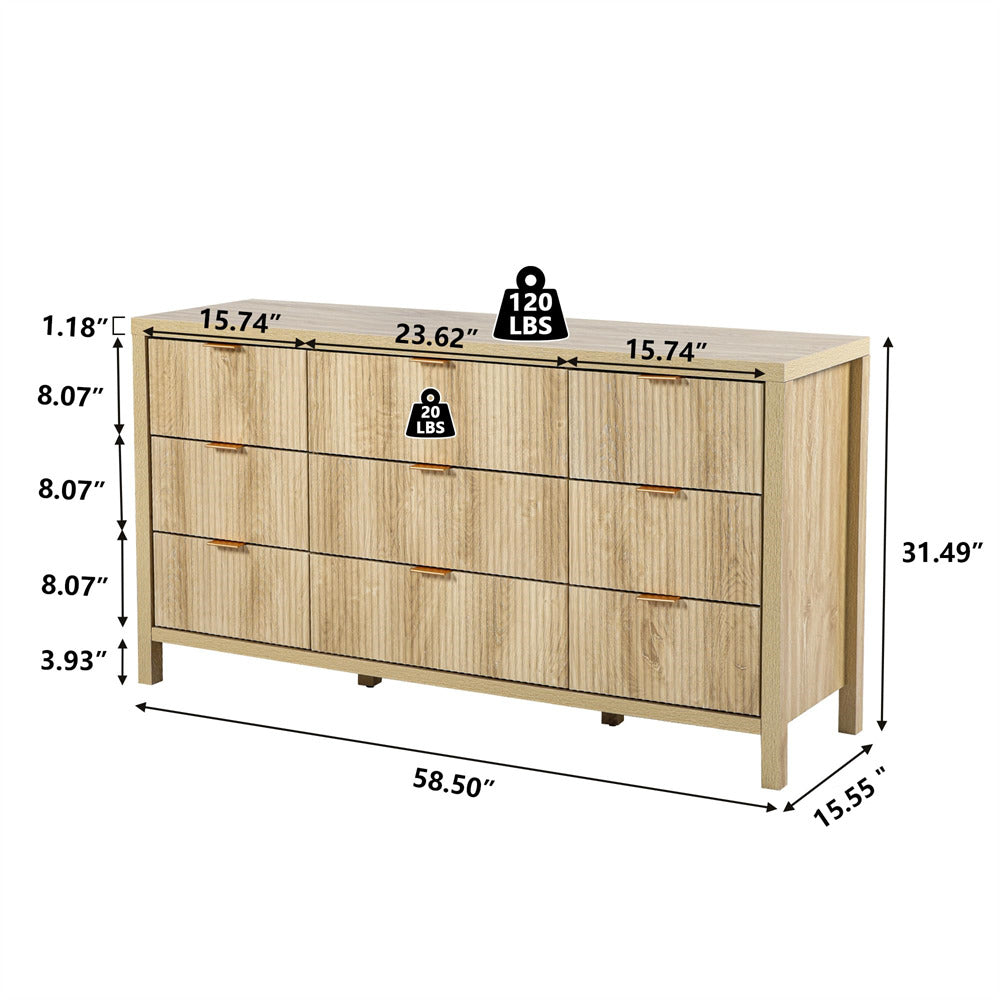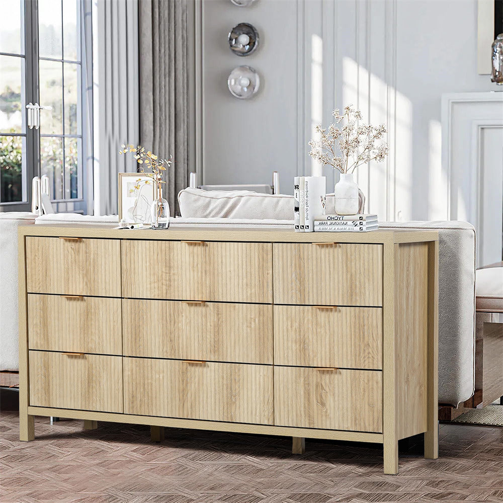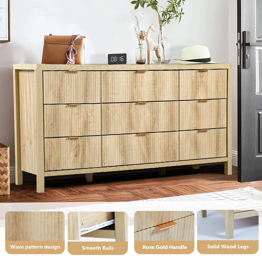 Mid-century Modern 9 Drawer Dresser: Made of original wood, various decoration styles are compatible with this retro style storage dresser & cabinet. Solid wood frame and antique gold hardware blend perfectly with detail-rich natural wood caning. This clean-lined bedroom dresser is a striking choice for any transitional or contemporary room.