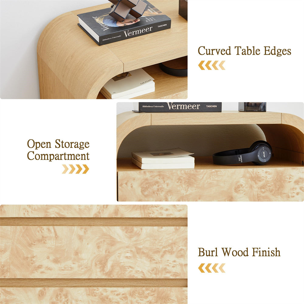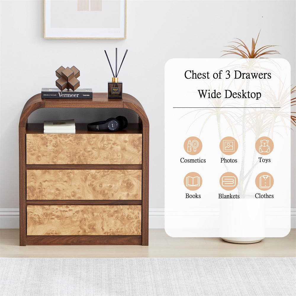 Burl Wood Dresser: The burl wood boasts rich grain patterns and a unique texture. This exquisite finish effortlessly elevates any space, adding a touch of vintage elegance. Whether your home style is modern, farmhouse, or rustic, this 3 drawer dresser with open shelf serves as the perfect decorative accent.