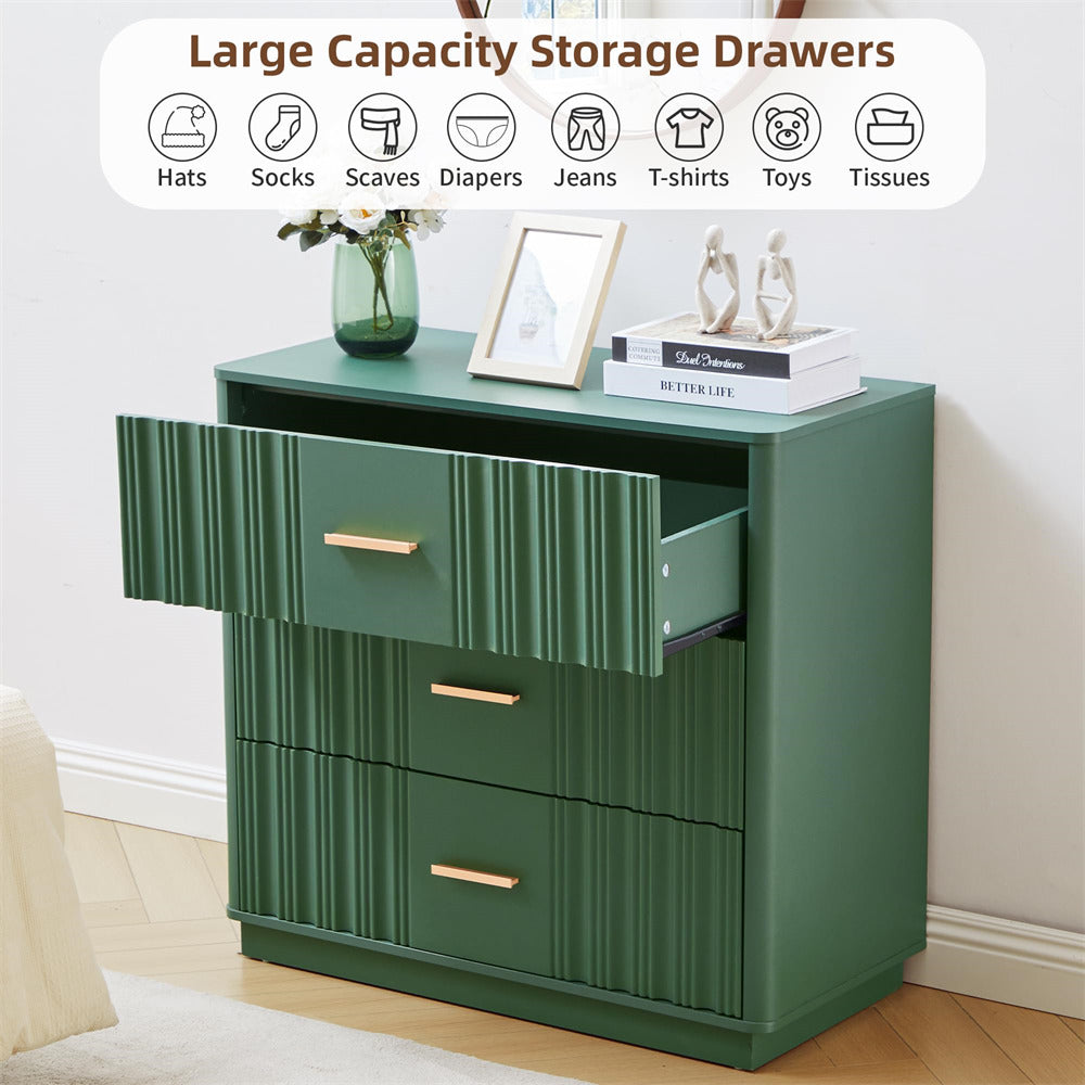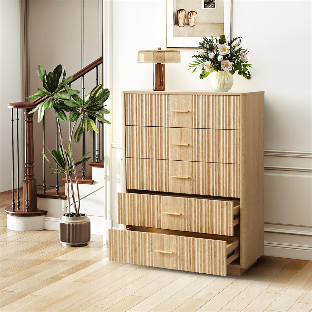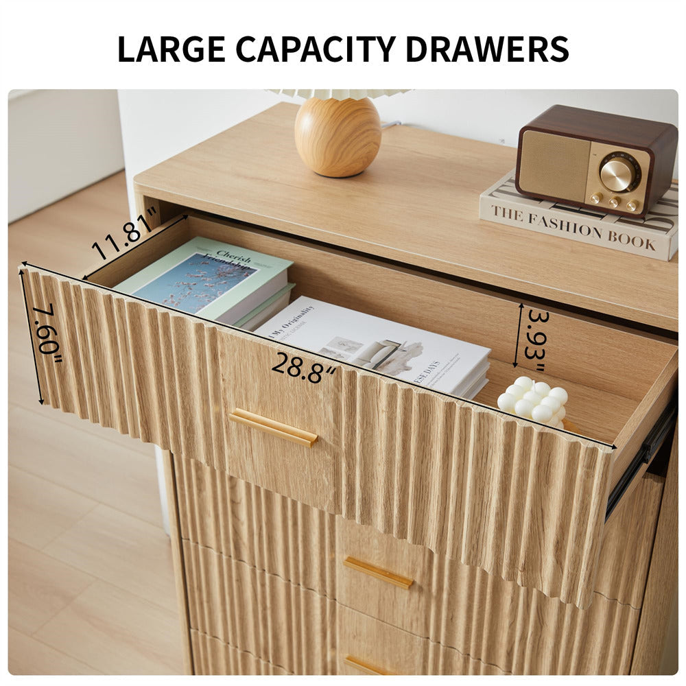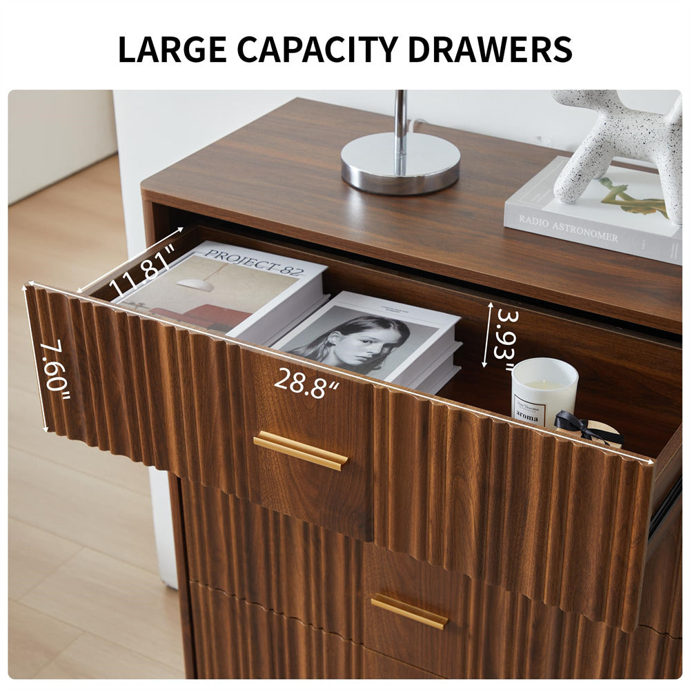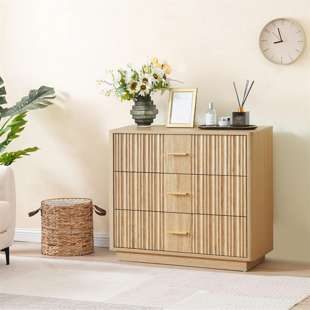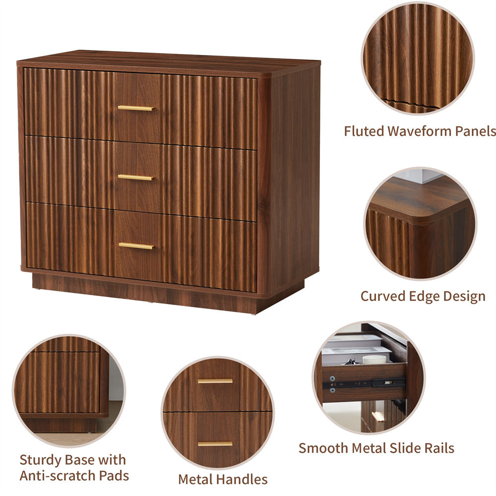 Modern Chic Design: The fluted waveform panel with sleek curved profile design is unique and elegant. This bedroom dresser is complete with metal handles, the smooth metal guide rail allows the drawer to be pulled out and closed easily and silently, it provides the drawers with durability.