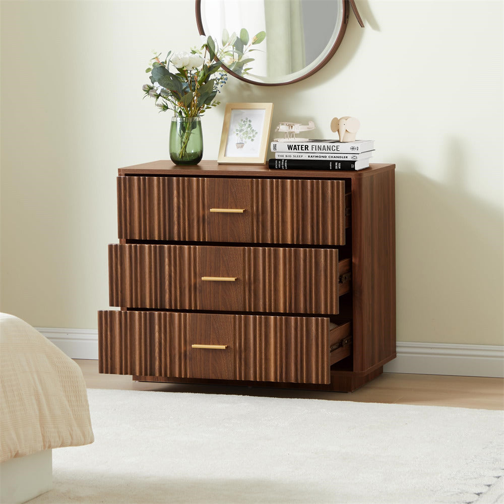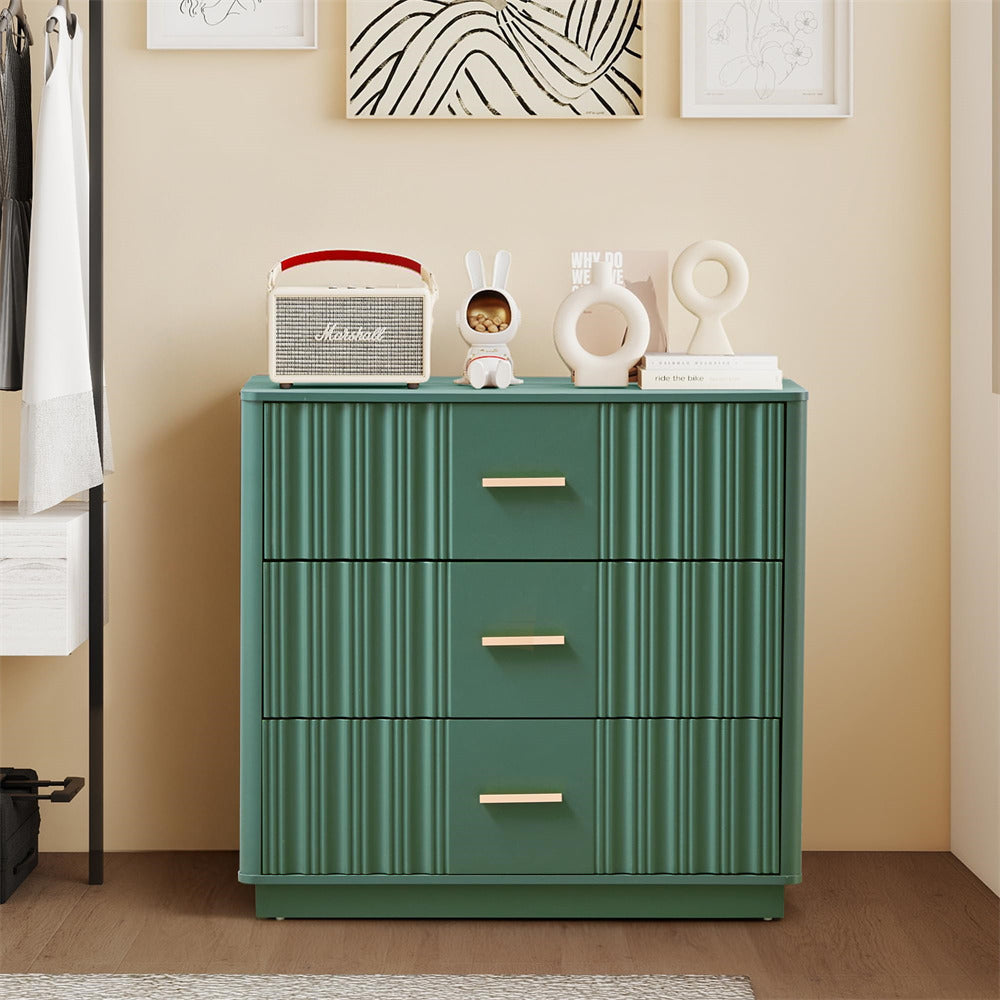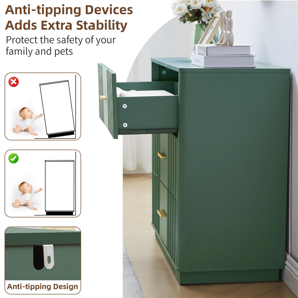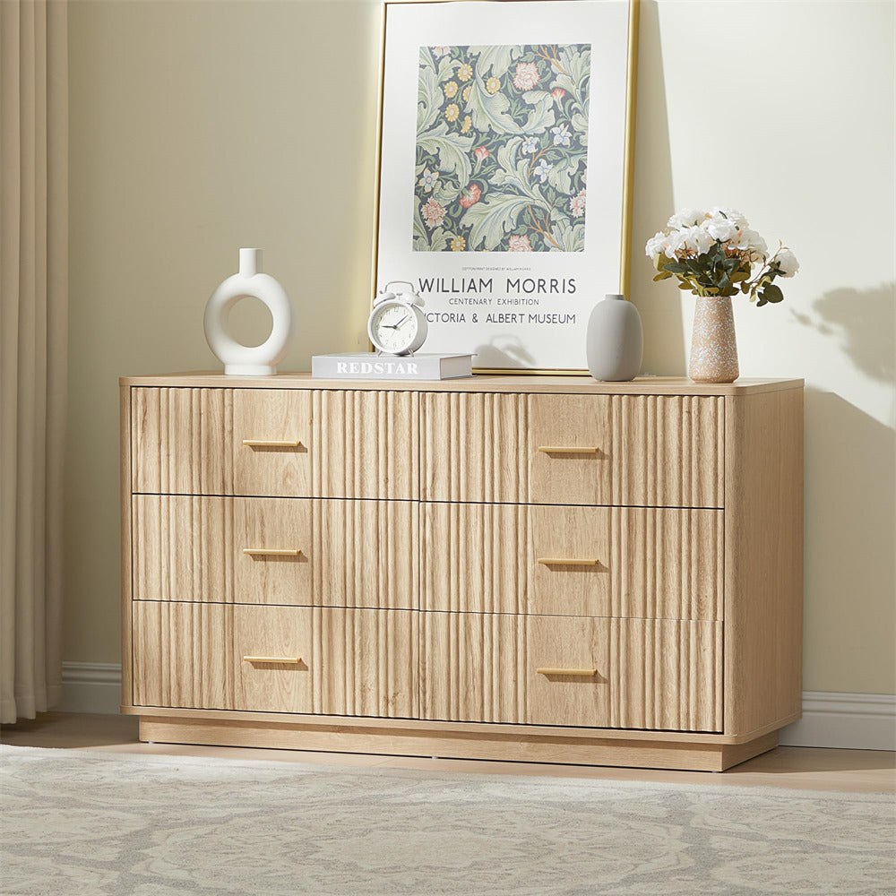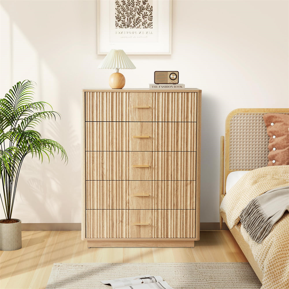 Modern Chic Design: The fluted waveform panel with sleek curved profile design is unique and elegant. This bedroom dresser is complete with metal handles, the smooth metal guide rail allows the drawer to be pulled out and closed easily and silently, it provides the drawers with durability.