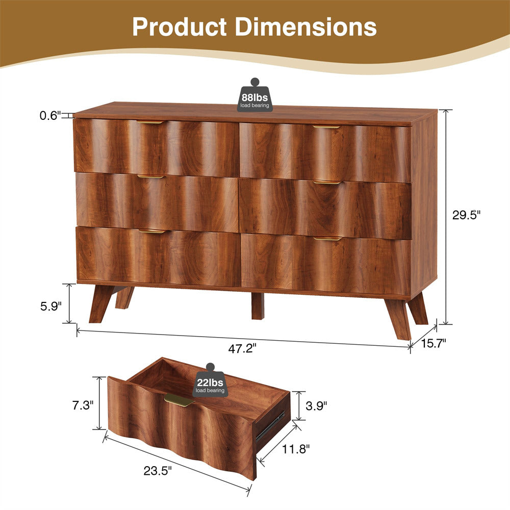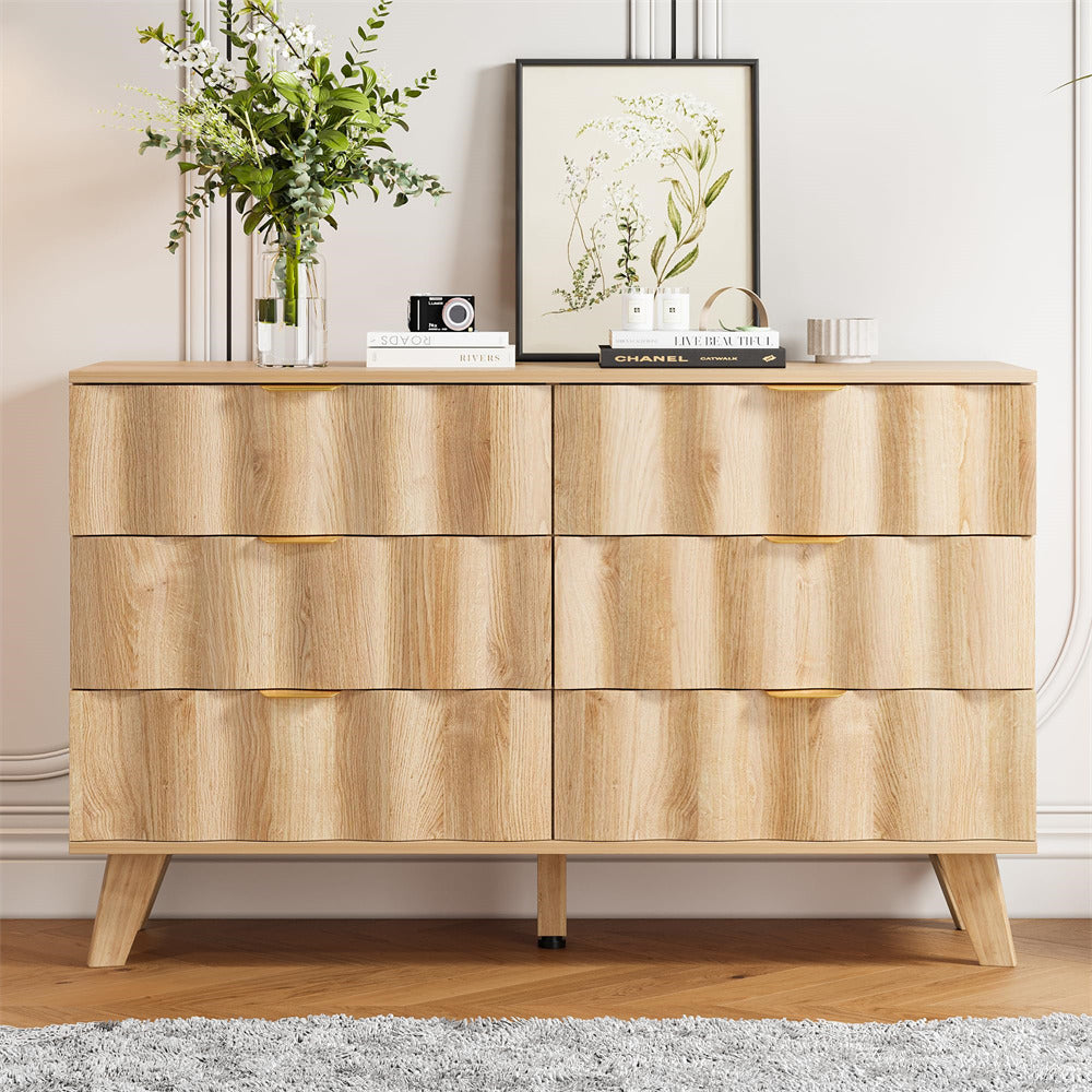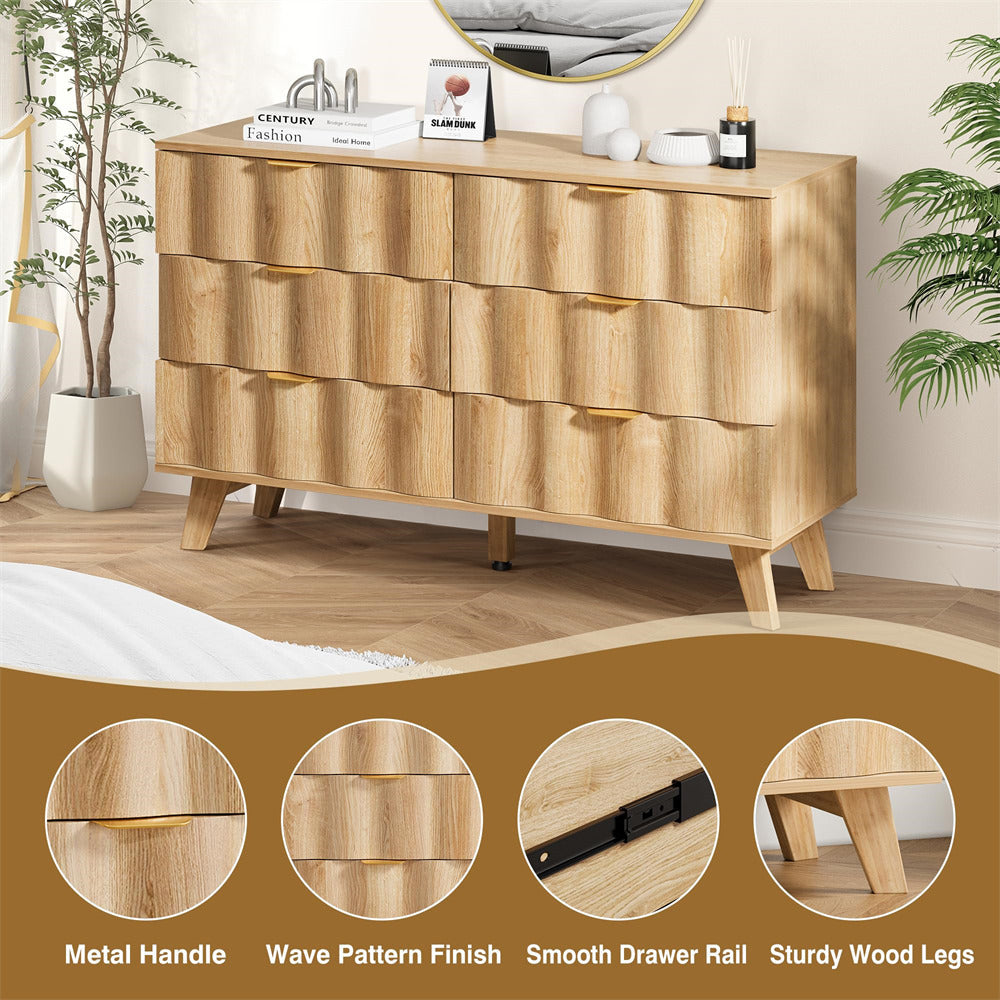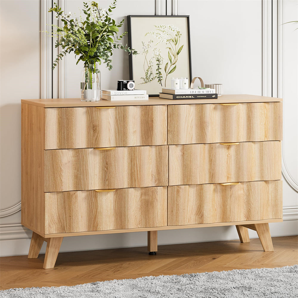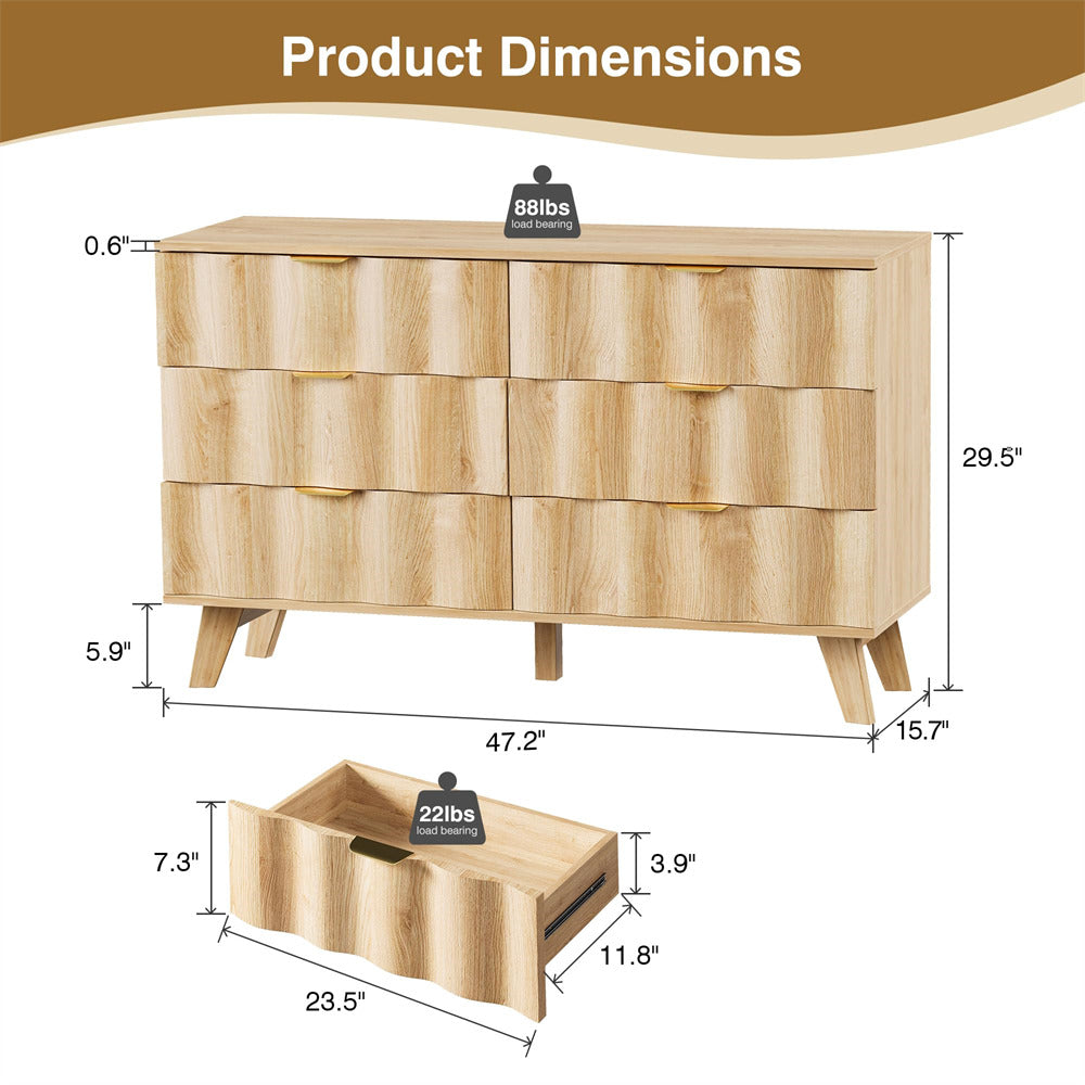 Modern 6 Drawer Dresser: Our chest of 6 drawers features wave pattern finish on the drawers, combined with the wood grain and tapered wood legs that create a modern, bohemian style. A fluted drawer dresser not only help you tidy your room, but also serve as a decoration to make your home more attractive.